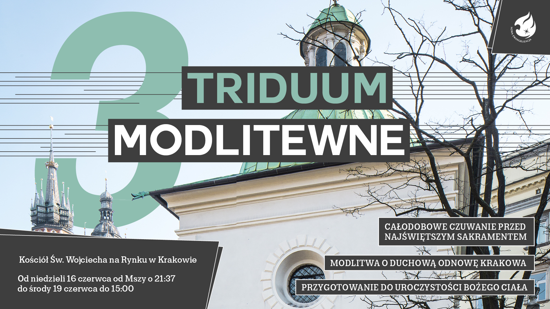 MODLITEWNE TRIDUUM będzie także wprowadzeniem do WYDARZENIA EWANGELIZACYJNEGO „JESTEM DOBRY”, które odbędzie się na Rynku Głównym przed Bazyliką Mariacką 19 czerwca (środa) w godzinach od 19.00-22.00. Bardzo gorąco proszę wszystkie krakowskie wspólnoty parafialne, Ruchy i Wspólnoty katolickie działające w Archidiecezji oraz Zgromadzenia Zakonne o włączenie się w dyżury modlitewne TRIDUUM.