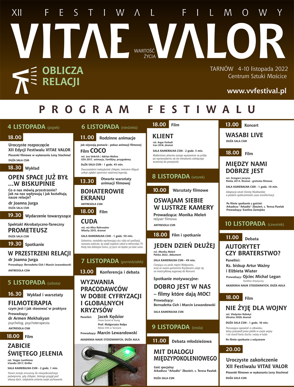 Od 4 do 10 listopada zapraszamy na codzienne relacje z wydarzenia na antenie Radia Profeto oraz do Centrum Sztuki Mościce w Tarnowie na projekcje filmowe, debaty, koncert, warsztaty oraz spotkania dyskusyjne w ramach 12 edycji Festiwalu Filmowego Vitae Valor!