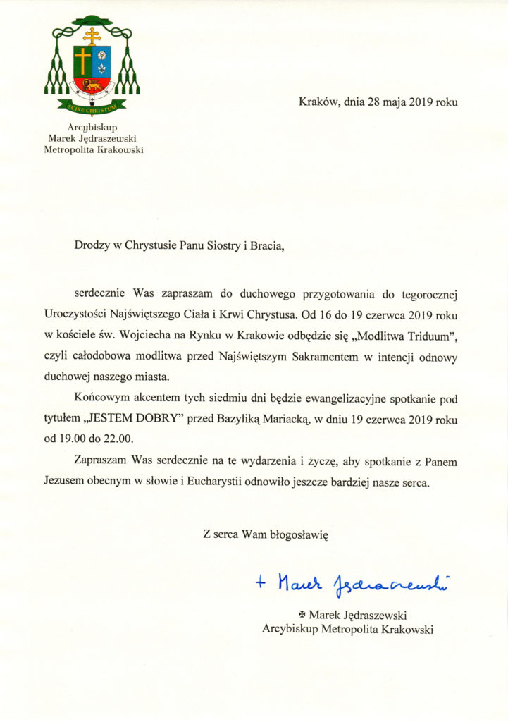 Z upoważnienia Ks. Arcybiskupa Marka Jędraszewskiego zapraszam serdecznie do udziału w całodobowym MODLITEWNYM TRIDUUM przed Najświętszym Sakramentem o duchową odnowę Krakowa, jako przygotowanie do UROCZYSTOŚCI BOŻEGO CIAŁA.